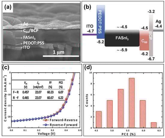 - Meng, X.Y.; Wu, T.H.; Liu, X.; He, X.; Noda, T.; Wang, Y.B.; Segawa, H.; Han, L.Y. Highly Reproducible and Efficient FASnl3 Perovskite Solar Cells Fabricated with Volatilizable Reducing Solvent. J. Phys. Chem. Lett. 2020, 11, 2965–2971. [Google Scholar] [CrossRef] [PubMed]