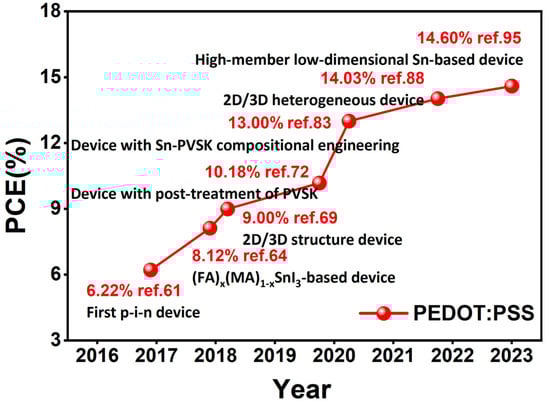 | (PEA)2(FA)n-1SnnI3n+1 | ITO/LiF/PEDOT:PSS/PVSK/C60/BCP/Ag | 470 | 20.07 | 74.00 | 6.98 | [92] |