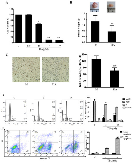 TIA suppresses U87MG cell growth by inducing apoptosis. (A) MTT assay to analyze the effect of TIA on U87 MG cell growth. (B) Effect of TIA on tumor weight. (C) IHC staining of Ki67 on tumors derived from mice treated with vehicle and TIA. (D) Effect of TIA on cell cycle progression of U87 MG cells. (E) Effect of TIA on apoptosis in U87MG cells. Data are the mean ± S.E.M. (n = 3). * p < 0.05 vs. controls; ** p < 0.01 vs. controls. C: control group of cells; 1.25–10: treatment of cells with 1.25–10 μM TIA; M: vehicle group of U87MG-bearing mice; TIA: oral administration of TIA (1 mg/kg/d, I.P., 14 days) to U87MG-bearing mice.