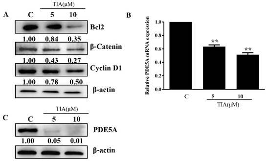 TIA is likely to downregulate the abundance of Bcl-2, β-catenin, and cyclin D1 through the suppression of PDE5. (A) Effects of TIA on the levels of Bcl-2, β-catenin, and cyclin D1 in U87 MG. (B,C). Effects of TIA on the mRNA (B) and protein (C) amounts of PDE5 in U87MG. Data are the mean ± S.E.M. (n = 3). ** p < 0.01 vs. controls. C: control group; 5: treatment with 5 μM TIA; 10: treatment with 10 μM TIA.