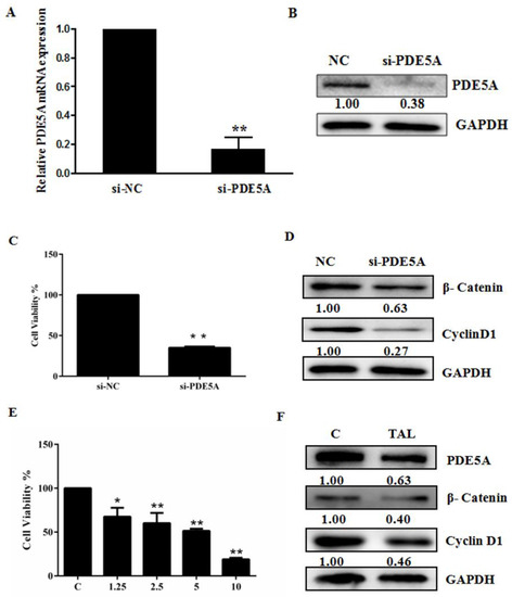 Interfering with PDE5A suppressed U87MG cell growth via the β-catenin pathway. (A,B) Effect of PDE5A siRNA on PDE5A mRNA (A) and protein (B) expression levels in U87 MG. (C–F) Effect of PDE5A knockdown and TAL inhibitor on cell growth and expression levels of PDE5, β-catenin, and cyclin D1 in U87 MG cells. Data are the mean ± S.E.M. (n = 3). * p < 0.05 vs. controls; ** p < 0.01 vs. controls. C: control group; 1.25–10: treatment with 1.25–10 μM TAL.