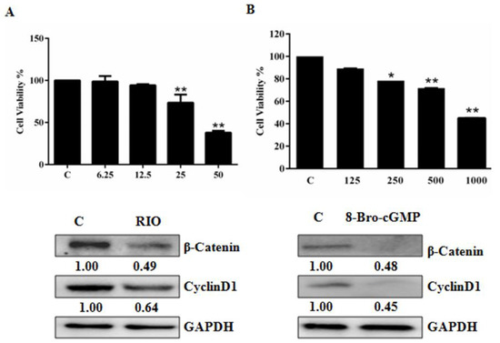 sGC stimulator RIO and cGMP analog 8-Bro-cGMP inhibited glioblastoma cell growth. (A) Effects of RIO and 8-Bro-cGMP on U87MG cell growth. (B) Effects of RIO and 8-Bro-cGMP on the abundance of β-catenin and cyclin D1. Data are the mean ± S.E.M. (n = 3). * p < 0.05 vs. controls; ** p < 0.01 vs. controls. C: control group; 6.25–50: treatment with 6.25–50 μM RIO; 125–1000: treatment with 125–1000 μM 8-bro-cGMP.