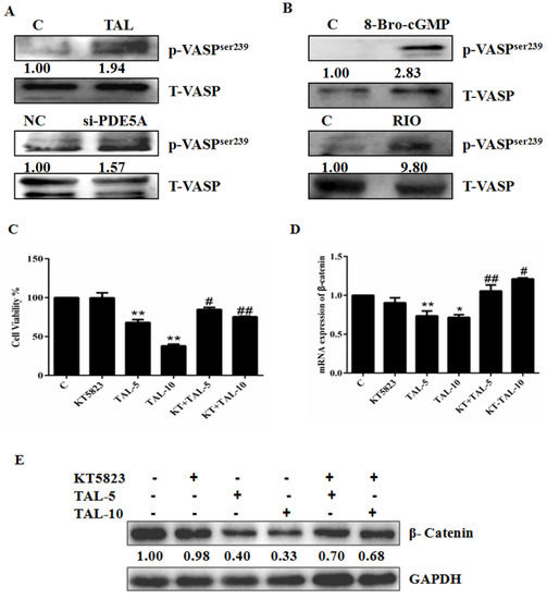 Activation of the cGMP pathway induces growth inhibition in glioblastoma cells. (A) Effect of TAL and si-PDE5 on the level of serine239-phosphorylated VASP in U87MG cells. (B) Effect of 8-Bro-cGMP and RIO on the level of serine239-phosphorylated VASP in U87MG cells. (C) Effects of KT5823 combined with TAL or alone on U87MG cell growth. (D) Effects of KT5823 combined with TAL or alone on mRNA expression of β-catenin. (E) Effects of KT5823 combined with TAL or alone on protein expression of β-catenin. Data are the mean ± S.E.M. (n = 3). * p < 0.05 vs. controls; ** p < 0.01 vs. controls. # p < 0.05 vs. TAL treatment alone; ## p < 0.01 vs. TAL treatment alone. C: control group; KT5823: treatment with KT5823; TAL-5/TAL-10: treatment with TAL at 5 or 10 μM; KT+TAL-5/KT+TAL-10: treatment with KT5823 plus TAL at 5 or 10 μM.
