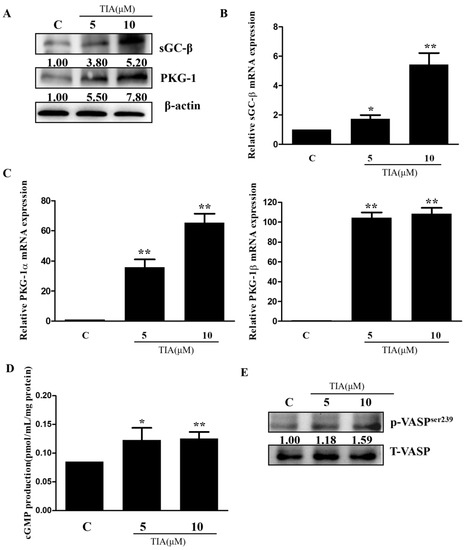 TIA activates the cGMP pathway in U87MG cells. (A–C) Effect of TIA on the mRNA and protein expression levels of sGCβ and PKG in U87MG. (D) Effect of TIA on the cellular level of cGMP in U87MG cells. (E) Effect of TIA on the phosphorylation level of vaspser239 protein in U87MG cells. Data are the mean ± S.E.M. (n = 3). * p < 0.05 vs. controls; ** p < 0.01 vs. controls. C: control group; 5: treatment with 5 μM TIA; 10: treatment with 10 μM TIA.