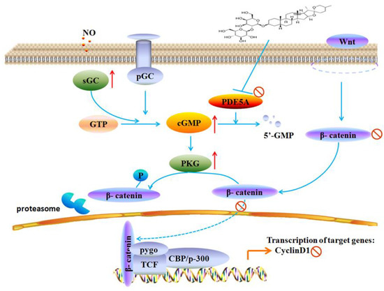 The cells were divided into different groups with particular treatments. After washing with iced PBS, the cells were harvested by adding phosphatase inhibitor, protease inhibitor, and RIPA buffer on ice, and then centrifuged at 4 °C to 12,000× g rpm for 15 min. The protein concentrations of the clarified supernatants were determined by a BCA protein assay kit. Then, 30 μg protein was resolved on 10% SDS-PAGE and transferred to PVDF membranes. These membranes were blocked with 5% nonfat dry milk for 1 h and incubated in primary antibodies against β-actin, Bcl-2, β-catenin, cyclin D1, PDE5A, PKG1, sGCβ, T-VASP, and p-VASPser239 in 5% BSA solution, and then incubated overnight at 4 °C. Following several washes, the membranes were incubated with the corresponding secondary antibody. Next, the membranes were washed with TBST for 5 min × 6 times. After that, the blots were developed using an ECL kit.