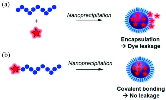 Schematic diagram of the preparation of fluorescent polymer nanoparticles: (a) physical encapsulation; (b) covalent attachment [31]. Copyright (2021), with permission from Royal Society of Chemistry.