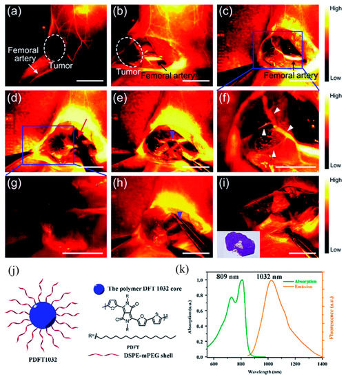 Schematic of DPP-based semiconducting polymer PDFT nanoscale self-assembly and imaging. (a) The vascular mapping and the hemodynamic status of the tumor and the femoral artery were determined. The white dashed circle contours the location of the tumor. (b,c) The branch of the femoral artery that supports the tumor and the vascular network of the tumor (exhibited as a claw shape) were clearly identified. (d) A vessel clamp was used to block the blood flow (red arrow) and the signal of the vascular network vanished. (e) After 5 min, the clamp was removed and the blood flow of the tumor was still devoid because a temporary thrombus was formed (blue arrowhead). (f) Magnification of (c). The vascular network of the tumor was clearly identified (white arrowheads). (g) Magnification of (d). (h) The major artery was surgically incised (blue arrowhead). (i) NIR-II imaging exhibited the absence of the residual tumor fluorescence and normal circulation (femoral artery) was successfully maintained. Inset is the histological analysis of the osteosarcoma. Scale bar: 8 mm. (j) Schematic drawing of a PDFT1032 nanoparticle composed of semiconducting polymer DFT and a hydrophilic DSPE-mPEG shell. (k) Absorbance and fluorescence spectrum of PDFT1032 showing an absorption peak at 809 nm and a fluorescence peak at 1032 nm with an 808 nm excitation laser [37]. Copyright (2018), with permission from Royal Society of Chemistry.