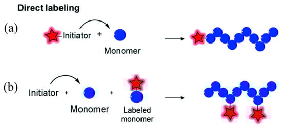 There are two ways to prepare covalently linked fluorescent polymer nanomaterials [31,40]: one is to first copolymerize polymer monomers into polymer chains, and then use covalently linked methods. The fluorescent-emitting group is attached to the polymer chain, and then prepared into nanoparticles. As shown in Figure 3a, it is referred to as “aggregate first and then join”. The nanoparticles prepared in this way have good stability, and the desired multifunctional nanoparticles can be customized by selecting different polymer nanoparticles. However, this preparation method requires functional group matching between empty polymer nanoparticles and fluorescent groups, and its universality is slightly worse than physical packaging. In addition, fluorescent group materials are also prone to fluorescence quenching on the surface of nanoparticles [41,42]. The second approach is to prepare fluorescent groups and polymer monomers into fluorescent polymer monomers, then copolymerize and self-assemble them into fluorescent polymer nanomaterials, as shown in Figure 3b, referred to as “connection first and then polymerization”. The distribution of light-emitting groups in the fluorescent nanoparticles prepared using this method is relatively more uniform, and the optical stability is good. However, there is also the problem that the size of fluorescent polymer nanoparticles is not easy to control due to the steric hindrance of the luminescent group [43,44].
