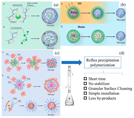 The nanogel preparation method [90] is shown in Figure 6. The traditional preparation methods mainly include emulsion polymerization, microemulsion polymerization and dispersion polymerization, all of which need to add stabilizers or surfactants to stabilize the reaction system and avoid aggregation and precipitation. However, it is difficult to remove the stabilizer or surfactant from the reaction system after the reaction, which affects the application of polymer microspheres in the biomedical field [91]. The method of precipitation polymerization was first proposed by Chibante et al. [92]. The stabilizer is replaced by a cross-linking agent, which is added to the reaction system together with the reactive monomer, and polymer microspheres with uniform particle size and clean surface are prepared after heating and polymerization. However, this method is only suitable for the polymerization of hydrophobic monomers and cannot prepare polymer microspheres for biomedicine. To expand the application of precipitation polymerization to hydrophilic monomers, Yang et al. [93] developed a distillation precipitation method, which shortened the precipitation polymerization time to 1–2 h. However, with the decrease in the solvent amount in the reaction system, the late reaction was unstable and the product yield was low. Wang et al. [94] developed the reflux precipitation polymerization method based on the technique of distillation precipitation. A return-shaped condenser was connected to the reaction device to ensure that the volume of the solvent in the reaction system remained unchanged, making the polymerization of the reaction system more stable. Compared with the traditional preparation method, the reflux precipitation polymerization method has the characteristics of short time consumption, no need for stabilizer, clean particle surface, simplicity of device, and less byproducts.