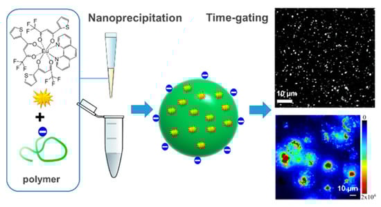 - Cardoso Dos Santos, M.; Runser, A.; Bartenlian, H.; Nonat, A.M.; Charbonnière, L.J.; Klymchenko, A.S.; Hildebrandt, N.; Reisch, A. Lanthanide-complex-loaded polymer nanoparticles for background-free single-particle and live-cell imaging. Chem. Mater. 2019, 31, 4034–4041. [Google Scholar] [CrossRef]