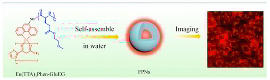 In order to solve the problem of uneven distribution of fluorescent materials in polymer nanosystems, Xu et al. [116,117] modified hydroxyl and amino groups on Eu(TTA)3phen, respectively. As shown in Figure 9a and Figure 10, two complexes, [Eu(TTA)3phen]-OH and (Eu(TTA)3phen]-NH2, were prepared. They then reacted with hydrophilic polymers PEG2000 and GluEG NCA through covalent connection to generate [Eu(TTA)3phen]-PEG2000 and [Eu(TTA)3phen]-GluEG, respectively, and self-assembled into water-soluble nanoparticles. They emi the 614 nm characteristic peak of Eu(III) ion in aqueous solution, and can be successfully taken up by L929 cells and HeLa cells, and emit strong red light (as shown in Figure 9b and Figure 10).