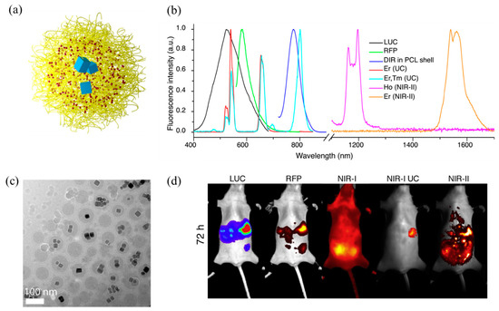 Rare earth-doped upconversion luminescent materials are generally hydrophobic. Generally, water-soluble bioluminescent probes are prepared by modifying the surface function of materials with SiO2 that has better biocompatibility, water-soluble polymers (PEG, PAA, PEI, etc.), and polyols. Tao et al. [120] used the block polymer PEO-b-PCL to wrap NIR-I emitting rare earth nanocrystalline materials NaYF4:Yb/Ho(DiR) and NIR-II-emitting NaCeF4:Er/Yb(LNPs). And luciferase (LUS) and red fluorescent protein (RFP) were doped into the polymer to prepare a multifunctional nanomaterial that can simultaneously generate NIR-I and NIR-II fluorescence spectra (as shown in Figure 12a–c). Then, the nanomaterials were injected intraperitoneally into mice with ovarian cancer, and fluorescence signals of two spectra could be found in the ovarian LUS+/RFP+-responsive cancer cell OVCAR-8 (Figure 12d).