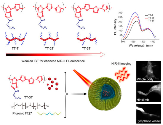 In order to improve the fluorescence quantum efficiency of semiconducting polymers, Fan et al. used low-energy-band ester-based semiconducting polymers to skillfully control intramolecular charge transfer (ICT) to increase the intensity of NIR-II fluorescence [133]. As shown in Figure 14, as the thiophene group chain lengthened (TT-T to TT-3T), the ICT gradually weakened, and the corresponding NIR-II fluorescence emission gradually increased. TT-3T CPs (51–70 nm) were prepared by physically wrapping TT-3T with amphiphilic block polymer F127. They emit NIR-II light (1050 nm) in aqueous solution with a fluorescence quantum efficiency of 1.75%. Moreover, in vivo cell tracking, vascular system imaging, and lymphatic drainage mapping all had good imaging effects and high NIR-II spatial resolution.