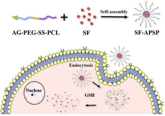 Consequently, in this study, the amphiphilic copolymer APSP was synthesized to deliver SF to the tumor site (Figure 1). In this nanoplat form, polyethylene glycol (PEG) and poly-ε-caprolactone (PCL) were used as the hydrophilic and hydrophobic segments, respectively, due to their favorable biocompatibility, biodegradability, and easy functional modification [31,32]. Disulfide bonds (-SS-) can be decomposed into thiols in the presence of GSH, so they were introduced to react to the high levels of GSH to allow rapid intracellular drug release. In addition, AG, a liver cancer-targeting ligand with anticancer effects, was also chosen to modify the polymer for tumor targeting. The SF-APSP micelles were designed for specific tumor cells with reduction-responsive characteristics, which allows the targeting of tumor cells through GLUT-1 and the modulation of drug release by GSH. The synthesis of the polymer, the preparation and characterization of the SF-APSP micelles, as well as the in vitro and in vivo assessments are elaborated in this paper.