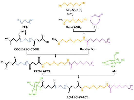 In this study, APSP were prepared by reactions involving several steps. Firstly, polyethylene glycol (PEG) was attached with butanedioic anhydride to form double carboxyl terminated polyethylene glycol (COOH-PEG-COOH). Next, di-tert-butyl dicarbonate was used to protect the amine group at one end of the cysteamine dihydrochloride to obtain Boc-SS-NH2. Then, polycaprolactone was introduced to prepare Boc-SS-PCL by forming an amide bond between the primary amino groups of Boc-SS-NH2 and carboxyl groups of polycaprolactone, and then Boc deprotection was carried out using TFA to obtain NH2-SS-PCL. Then, PEG-SS-PCL (PSP) was obtained via the formation of the amide bond between the primary amino groups of NH2-SS-PCL and the carboxyl groups of COOH-PEG-COOH. Lastly, APSP was obtained by combining PEG-SS-PCL with glucosamine hydrochloride by carbodiimide chemistry.
