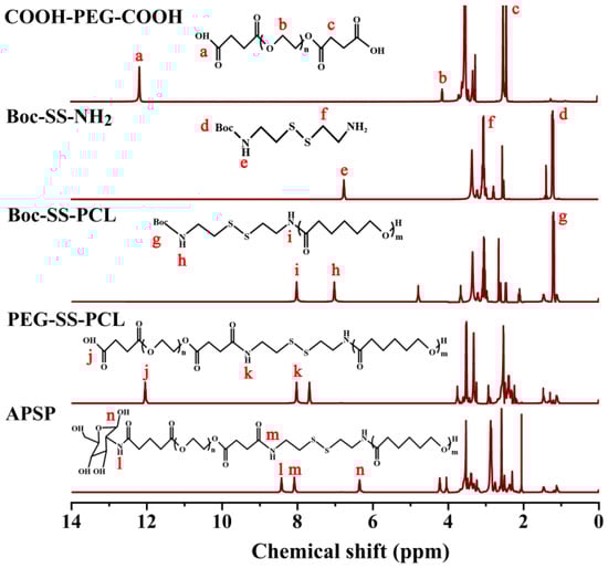 The synthesis route of APSP was shown in Figure 2. The chemical structure of APSP polymers was confirmed by 1H NMR spectroscopy (Figure 3). For COOH-PEG-COOH, signals at 2.46 ppm were attributed to the methyl peak of -COO- and -OC-. The peaks at 3.52 and 3.74 ppm belonged to the methylene peaks of -O-CH2- in the segment of PEG. In addition, there was a characteristic peak of the carboxyl group at approximately 12.22 ppm. The above results proved that the terminal dicarboxyl modification of the PEG was 1synthesized successfully. In the spectra of Boc-SS-NH2, the characteristic peaks at 1.19 ppm, 1.42 ppm, and 2.55~3.99 ppm were ascribed to (CH3)3-, (-CH2-NH2), (-S-CH2-CH2-) of the cysteamine dihydrochloride units, respectively. The presence of the characteristic peak of the amide bond at 6.77 ppm (-CO-NH-) in the spectrum, proved that di-tert-butyl dicarbonate was successfully connected to the cysteamine dihydrochloride. Compared with Boc-SS-NH2, several new signals were identified in the spectra of Boc-SS-PCL. The signals at 4.06 ppm, 2.29 ppm, 1.64 ppm, and 1.36 ppm belonged to the protons of the PCL segment, and the peaks at 8.04 ppm and 7.06 ppm were due to a new amide bond formation between the amino group of PCL and carboxyl group of Boc-SS-NH2. In the spectrum of PEG-SS-PCL, the characteristic peak of the carboxyl group appeared at 12.18 ppm, which indicated the formation of PEG-SS-PCL. Compared with the spectra of PEG-SS-PCL, the peak for the carboxyl group at 12.18 ppm disappeared in the 1H NMR spectra of APSP, replaced by the formation of a new amide bond at 8.14 ppm, which was significant evidence for the synthesis of APSP. These results confirmed that APSP conjugates were successfully synthesized.