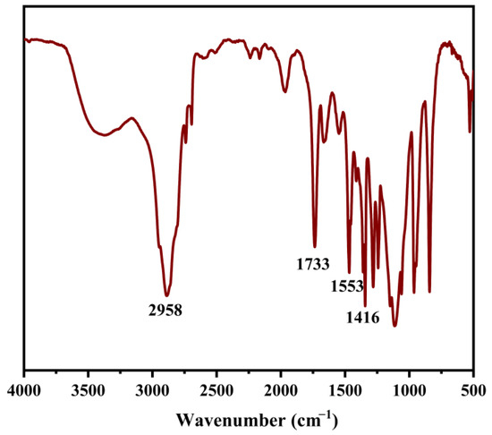 To further demonstrate the polymer formation, the FTIR spectra of APSP are presented in Figure 4. The characteristic peaks at 2958 cm−1 appeared which corresponded to the N-H stretching vibrations in an amide bond, and the C=O in a carbonyl group. Moreover, there were distinct peaks at 1733 cm−1, 1553 cm−1, and 1416 cm−1, which were assigned to the C=O stretching vibration (amide I band), N-H bending vibration (amide II band), and C-N stretching vibration (amide III band) of the amide link, respectively. The above results indicated the successful synthesis of APSP.
