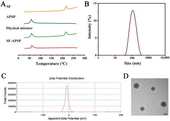 DSC profiles of SF-APSP micelles (A). Dynamic light scattering particle size (B) and zeta potential (C). Transmission electron micrograph of SF-APSP micelles (D).