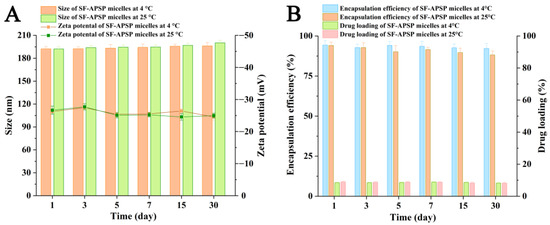 For pharmaceutical formulations, their stability during storage is very important. In order to examine stability, SF-PASP micelles were stored in sealed glass vials at 4 and 25 °C for 1, 3, 5, 7, 15, and 30 days and then the particle size and zeta potential were measured and recorded. DL% and EE% were calculated using the above method.