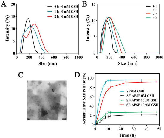 Size distributions of SF-APSP micelles at different time points in 40 mM GSH (A) and without GSH treatment (B). TEM images of SF-APSP micelles in 40 mM GSH for 4 h (C). Drug release profiles of SF-APSP micelles at different GSH concentrations (0 M, 10 μM, and 10 mM) at 37 °C (D).