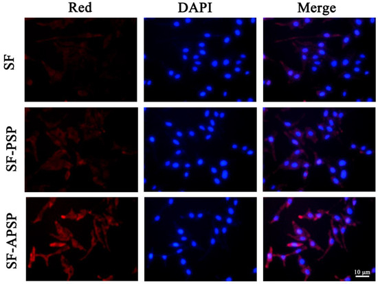 The red fluorescence of Nile red was obvious in the SF-APSP micelles group, while the free Nile red and SF-PSP micelles groups exhibited weak fluorescence. The Nile red released from SF-APSP micelles was stronger than SF-PSP micelles, indicating that the SF-APSP micelles had a significant active targeting effect and could be taken up effectively by the HepG2 cells (Figure 9). Modification of the vector by AG enhanced the binding ability of the micelles to AG-positive cells through AG receptor-mediated targeted delivery, which could be demonstrated by the highest fluorescence accumulation in HepG2 cells of the SF-APSP micelles group.