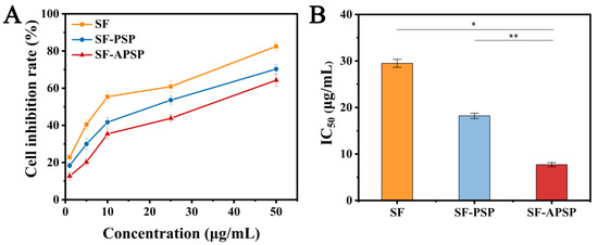 Cell inhibition rate (A) and IC50 values (B) after incubating with different SF formulations for 48 h (* p < 0.05, ** p < 0.01).