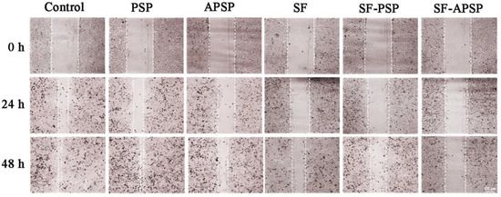 The inhibition of HepG2 cells migration by the SF solution, SF-PSP micelles, and SF-APSP micelles was investigated using a wound healing assay. In brief, HepG2 cells were seeded into 6-well plates and grown to near 100% confluency. After that, a scratch was made within the cell layer using the tips of sterile pipettes followed by multiple washings with PBS. The scratched monolayer of HepG2 cells was treated with different formulations (SF solution, SF-PSP micelles, and SF- APSP micelles [50 pg/mL each] and blank APSP micelles). Images of different groups were captured at 0, 24, and 48 h using an inverted fluorescence microscope. Untreated cells were used as the control.