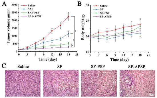 The generated tumor growth curves obtained by measuring the tumor volume after treatment are shown in Figure 13A. The tumors treated with saline could not be controlled and grew quickly. The tumor treated with free SF grew progressively, but at a slower rate than that of the control group. The tumor volumes in the SF-PSP micelles and SF-APSP micelles groups were markedly smaller than that in all other groups after treatments (p < 0.05). Importantly, mice treated with AG-modified drug carriers showed the strongest tumor inhibition effect and significantly reduced tumor development. There was no discernible difference between the micelle and saline groups, and the body weight of the free SF group was lower than that of the saline group (Figure 13B).