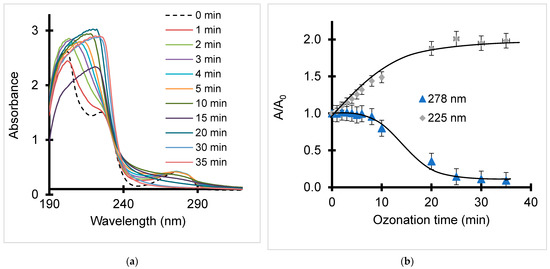 Ozone bubbling induced marked changes in the UV-Vis spectrum of BPA (Figure 1a), as reflected by a marked intensity increase for the 225 nm band (Figure 1b). The latter was attributed to π → π* transitions and suggests the rise of oxidized derivatives such as catechol, acetone, hydroquinone, formaldehyde, acetic, formic, maleic and oxalic acids and related H-bridges. Their persistence even after 40 min ozonation agrees with their high resistance to ozone [67,76]. Simultaneously, the 278 nm band showed a barely detectable intensity decrease for the first 8 min, likely due to the low and slow ozone solubility. This was followed by a pronounced decrease to almost a total depletion after 30 min of ozonation.