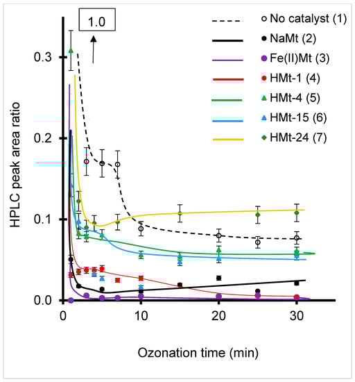 This sequence contrasts with that obtained by much more accurate HPLC-UV measurements, inasmuch as the 278 nm showed a much lower intensity decrease as compared to that assessed by HPLC for HMt-1 (Figure S5) and all the catalysts tested (Figure 3). Except for HMt-1, all catalysts displayed a clear and more pronounced decreasing tendency of the HPLC peak area ratio (dashed line) compared to the non-catalytic ozonation (black line) (Figure 3).