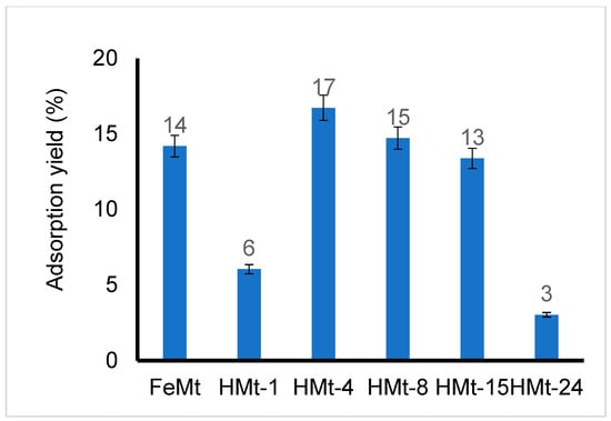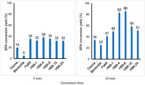 HPLC measurements already showed that Fe(II)Mt resulted in a higher BPA degradation yield of 24–41% than bentonite (0–25%) after 1–10 min ozonation (Figure 4). This performance accounts for the beneficial role of Fe2+ cation, but still remains lower than those produced by all HMt samples under similar conditions (49–86%). A possible explanation should consist of the lower BPA adsorption yield of Fe(II)Mt (14%) compared to HMt-4 (17%) and HMt-8 (15%) (Figure 5). Their higher affinity toward BPA must involve a stronger hydrophobic character as reflected by the their lower WRC and higher adsorption surface as illustrated by finer particle sizes (1.287 and 1.297 μm, respectively) compared to Fe(II)Mt (3.897 μm) (Table 1). This result unequivocally demonstrates that the extent and hydrophobicity of the solid surface have a more significant influence than Fe2+ cation.