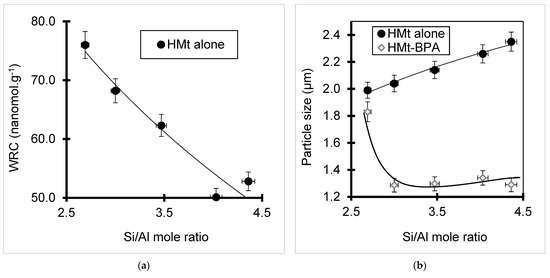 The reverse proportionality between the particle size and hydrophilic character expressed by the water retention capacity (WRC) as assessed by TPD in the absence of BPA (Figure 6) was in some way expected. Pronounced dealumination and decationization lead to lower surface charge density but a higher amount of hydrophobic Si–O–Si groups that favor clay–clay interaction at the expense of clay dispersion in water. This phenomenon seems to be reversed in the presence of BPA via competitive clay–BPA interaction.