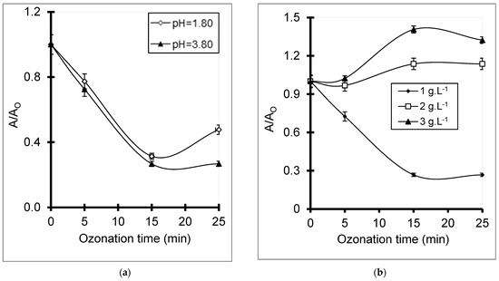 On the one hand, increasing pH from 1.80 up to 3.80 in the presence of 1 g·L−1 catalyst induced a slight enhancement of BPA decomposition reflected by a more pronounced decay of the relative intensity (A/Ao) of the 278 nm (Figure 8a). This can be explained by the fact that silanol deprotonation upon pH increase contributes to the ozonation process by enhancing grain dispersion. Prolonged ozonation times beyond 15 min induced a process attenuation, most likely by favoring the rise of acidic products at the expense of phenyl ring cleavage.