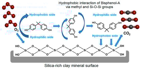 The latter should occur on clay surface, displaying weak affinity toward water expressed in terms of low water retention capacity [46]. BPA molecule should bear no charge at pH levels below 6–7, i.e., lower than its pKa (9.56–10.2) (Table S1). By analogy to phenol, BPA adsorption on HMt should not involve electrostatic interaction and ion exchange at these pH levels. Hydrophobic interaction of BPA methyl groups is expected to expose the hydroxyl groups to the solution bulk, conferring to clay–BPA particles a hydrophilic character that mitigates clay–clay interaction (Scheme 1).