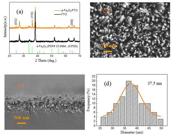 Figure 1a exhibits the XRD patterns of the as-prepared α-Fe2O3/FTO, FTO, and the standard diffraction peaks of α-Fe2O3 (PDF# 33-0664, JCPDS), respectively. It is clear that all the XRD diffraction peaks that appeared upon the α-Fe2O3 nanowire arrays are indexed to the rhombohedral phase α-Fe2O3 (PDF# 33-0664, JCPDS) [33,37]. The presence of the strong peaks suggests the high crystalline quality of the as-prepared α-Fe2O3 nanowire arrays. In particular, the (110) diffraction peak located at 35.2° is significantly enhanced, which implies that the as-prepared α-Fe2O3 nanowire arrays are highly oriented with a preferential growth orientation along the [110] direction. Figure 1b displays the top-view FESEM image of the as-prepared α-Fe2O3 nanowire arrays. As shown in Figure 1b, the size distribution on the entire surface of the α-Fe2O3 nanowire arrays is relatively uniform. Figure 1c shows the cross-sectional FESEM image of the as-prepared α-Fe2O3 nanowire arrays. It can be found that the α-Fe2O3 nanowire arrays with a length of about 550 nm have been observed, which can be acted as the dielectric material layer of the W/α-Fe2O3/FTO memory device. In addition, the diameter distribution histogram of the as-prepared α-Fe2O3 nanowire arrays further indicates that the average diameter of the α-Fe2O3 nanowire arrays is approximately 37.5 nm, as revealed in Figure 1d.