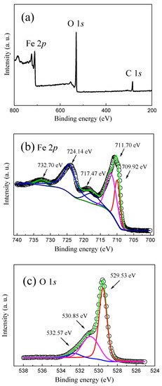 (a) Survey XPS spectra of the as-prepared α-Fe2O3 nanowire arrays. (b) Fe 2p and (c) O 1s high-resolution XPS spectra of the as-prepared α-Fe2O3 nanowire arrays.