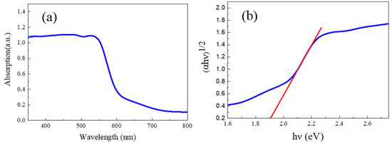 Figure 3a and Figure 3b indicate the UV-Visible absorption spectra and the corresponding Tauc plots of the as-prepared α-Fe2O3 nanowire arrays, respectively. As shown in Figure 3a, the as-prepared α-Fe2O3 nanowire arrays display excellent optical absorption capacity with an absorption edge of about 645 nm in the visible absorption region. In addition, the optical band gap (Eg) of the as-prepared α-Fe2O3 nanowire arrays can be evaluated with the following Tauc relation [3,38]: