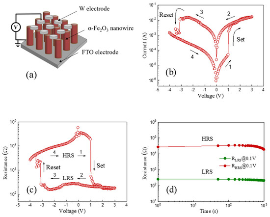 (a) The schematic configuration of the as-prepared α-Fe2O3 nanowire-based W/α-Fe2O3/FTO memory device. (b) The semi-logarithmic I-V curve of the device. (c) Resistance-voltage characteristic of the device. (d) Retention capability of the device.