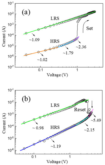 - Lee, J.Y.; Kim, J.; Baek, Y.; Choi, Y.J.; Kang, C.J.; Lee, H.H.; Yoon, T. Voltage-dependent resistive switching characteristics in mixed layer consisting of γ-Fe2O3 and Pt-Fe2O3 core-shell nanoparticles. Appl. Phys. Lett. 2014, 104, 093514. [Google Scholar] [CrossRef]