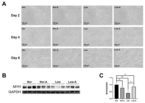 Differentiation abilities of the Nor, Nor-A, Low, and Low-A groups of C2C12 myotubes. (A) Morphology of the four groups of myotubes on Days 2, 4, and 6. (B) Western blot analysis of MYH expressions in the four groups of myotubes. The anti-GAPDH antibody was used to standardize the amount of the measured protein in each lane. (C) Statistical analysis of the protein expressions shown in panel B. Statistical significance: ns, p > 0.05; *, p < 0.05; **, p < 0.01 (n = 3).