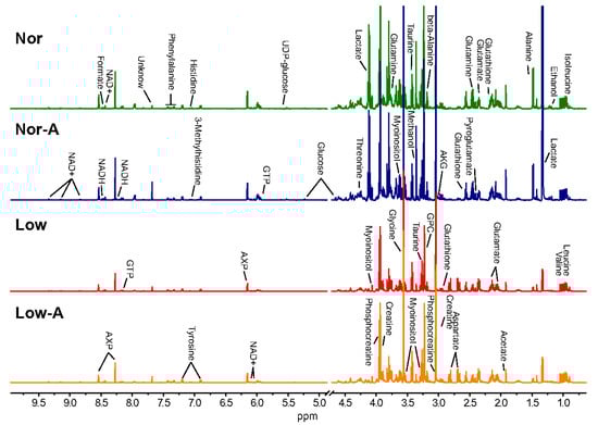 Average 600 MHz 1D 1H-NMR spectra recorded on aqueous extracts from the Nor, Nor-A, Low, and Low-A groups of myotubes. The vertical scales were kept constant in all the NMR spectra. The water region (4.7–4.9 ppm) was removed. Green/blue/red/orange lines: the spectral region from the Nor/Nor-A/Low/Low-A groups. Abbreviations: AKG, α-ketoglutarate; GPC, sn-glycerol-3-phosphocholine; UDP-glucose, uridine diphosphate glucose; GTP, guanosine triphosphate; NAD+, nicotinamide adenine dinucleotide; AXP, adenine mono/di/tri phosphate.