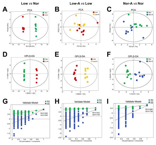We then performed supervised orthogonal partial least-squares discriminant analysis (OPLS-DA) to optimize the metabolic distinctions between the groups. The OPLS-DA score plots (Figure 3D–F) show clear metabolic distinctions between the groups. We performed a response permutation test (n = 200) to evaluate the reliability of the OPLS-DA model (Figure 3G–I). The obtained cross-validation plots show the following Q2 and R2 values: R2 = 0.999, Q2 = 0.998 for Low vs. Nor; R2 = 0.972, Q2 = 0.754 for Low-A vs. Low; and R2 = 0.846, Q2 = 0.768 for Nor-A vs. Nor, indicating that these established OPLS-DA models were reliable.