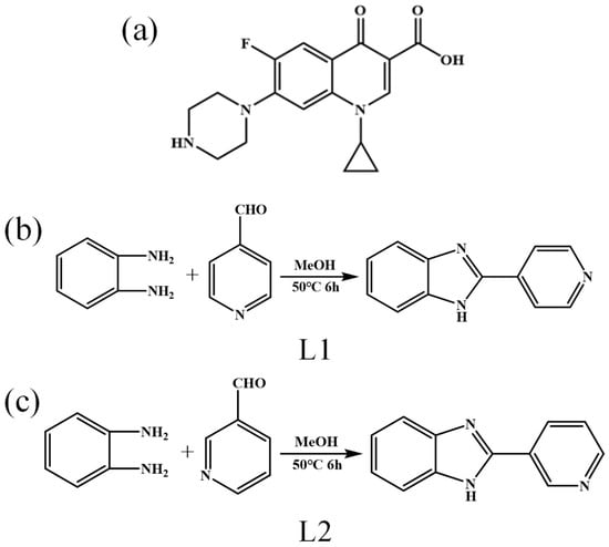In recent years, coordination compounds as an emerging material for photocatalysis have been widely used in water treatment and recycling fields [,,,,]. The benzimidazole ligands are usually used as N-donor ligands, which can adopt different conformations according to the coordination geometry requirements of different metal ions, and serve as donors and acceptors of hydrogen bonds [,,,,,]. This type of ligand has three aromatic rings (pyridine ring, benzene ring, and imidazole ring), which is easy to form a conjugated system that is conducive to strengthening the overall structure; and there are three nitrogen atoms in this type of molecule, they can be obtained by using nitrogen atoms to participate in the coordination with metal ions, while other nitrogen atoms easily form hydrogen-bonding interactions, which further extend the structure to a three-dimensional supramolecular network. Based on this, in this paper, two benzimidazole ligands L1 and L2 (Figure 1b,c) [] were selected, synthesized, and assembled with metal salts to obtain compounds 1–4 through room temperature reaction, and the obtained compounds were quantitatively produced and their photocatalytic degradation ability to ciprofloxacin containing wastewater was investigated. In addition, the effects of coexisting anions and organic compounds on the removal of CIP were also discussed.
