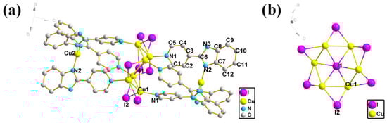 (a) Structural monomer diagram of compound 1. (b) Cu-I polygonal structure formed in compound 1. (The H atom is hidden.)