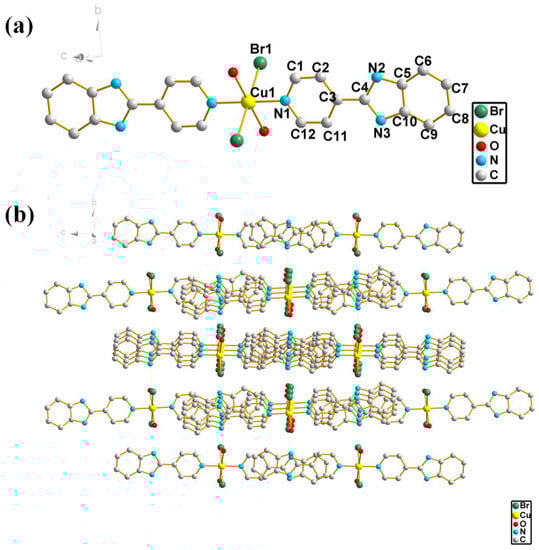 Compound 2 is obtained by evaporation at room temperature and its crystal form is green block. It must be mentioned that the valence state of Cu atoms in compound 2 has changed from +1 (CuBr) to +2 (C24H22Br2CuN6O2) during the self-assembly process at room temperature. X-ray single crystal diffraction analysis shows that compound 2 belongs to monoclinic system and space group P21/c. The unit cell parameters of compound 2 are as follows: a = 7.1021(13) Å; b = 11.769(2) Å; c = 14.147(3) Å; α = 90°; β = 99.243(7)°; γ = 90°. It can be seen from Figure 3a that L1 is a monodentate ligand, and Figure 3a below is a monomer diagram of compound 2, which shows that compound 2 is a mononuclear complex. Its smallest structural unit contains an L1 ligand, a copper atom, a bromine atom, and a water molecule. Among them, the copper atom forms a mononuclear complex by coordinating with the nitrogen atom on the pyridine ring. The associated bond lengths are Cu1-Br1 = 2.5170(5) Å, Cu1-N1 = 1.998(3) Å. The structure of compound 8 in the literature [] is similar to that of compound 2 in this paper, except for metal salt. The two compounds have different hydrogen bond strengths due to different atoms that form hydrogen bonds. Figure 3b shows the crystal packing diagram of compound 2 in the a-direction, and it can be concluded that compound 2 is a 0D structure. In addition, the relevant calculations show that the pyridine ring is approximately coplanar, where the dihedral angle between the plane N(1)C(1)C(2)C(3) and the plane N(1)C(12)C(11)C(3) is 0.240(177)°; the benzimidazole is also approximately coplanar, where the dihedral angle between the plane C(4)N(2)C(5)C(10)N(3) and the plane C(5)C(6)C(7)C(8)C(9)C(10) is 0.845(116)°. According to the analysis, the dihedral angle between the pyridine ring and benzimidazole is 2.357(85)°, which means that the ligand L1 is approximately coplanar in this structure.