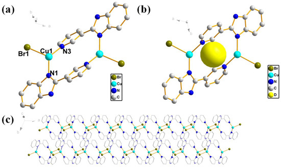 Compound 3 is a 1D structure. X-ray single crystal diffraction analysis showed that compound 3 belonged to triclinic system, space group P-1. The unit cell parameters of compound 3 are a = 7.8416(9) Å, b = 8.6988(9) Å, c = 9.9539(11) Å; α = 109.736(4)°, β = 94.939(4)°, and γ = 113.314(3)°. Figure 4a is the structural monomer diagram of compound 3. It can be seen from the figure that L2 is a bidentate ligand, and the N atom on the imidazole ring and the N atom on the pyridine ring are involved in the coordination with monovalent copper. The structure of the compound in the literature [] is basically similar to that of compound 3, except that the position of the N atom in the pyridine ring in the ligand and the metal salt used are different. The dihedral angle of pyridine ring and benzimidazole ring of the compounds in the literature is 54.6°, while the dihedral angle of the two rings in this paper is 38.357(81)°. In general, when ligand L2 is a monodentate ligand, the two rings are substantially coplanar; while when ligand L2 is a bidentate ligand, the two rings are not coplanar []. Moreover, compared to the structure in reference [], the copper atom of compound 3 in this paper is coordinated with two types of N atoms in the ligand, namely N1 and N3. The structure in reference [] is that the copper atom is coordinated with N atoms on benzimidazole, forming a one-dimensional chain structure. At the same time, as can be seen from Figure 4b, there is a ring in compound 3 into which we insert a pseudo-atom D. By relevant calculations, we conclude that the macrocyclic ring of compound 3 can pass through a molecule or substance with a radius of 1.41875 Å. The associated bond lengths are Cu1-N1 = 1.983(2) Å,Cu1-N32 = 2.025(2) Å. Figure 4c is the layered packing diagram of compound 3, and it can also be observed that compound 3 has a 1D chain structure.
