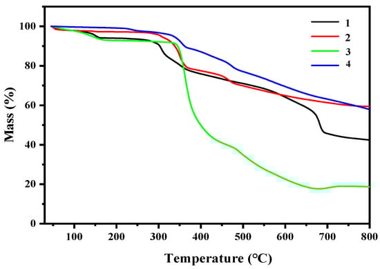 Under N2 atmosphere, the four compounds was tested by thermogravimetry at a temperature range of 30–800 °C, and the thermogravimetric curve is shown in Figure 6. By analyzing the thermogravimetric curve, we can obtain information related to the quality of the sample and its possible intermediate products, including their composition, thermal stability, thermal decomposition, and generated products. It can be seen from the figure that these compounds are basically stable when the temperature is lower than 300 °C, and they begin to decompose when the temperature reaches above 300 °C. The weight loss in the range of 30–400 °C may be the pyrolysis of the ligand. When it reaches above 400 °C, it is the decomposition of inorganic metal salt components.