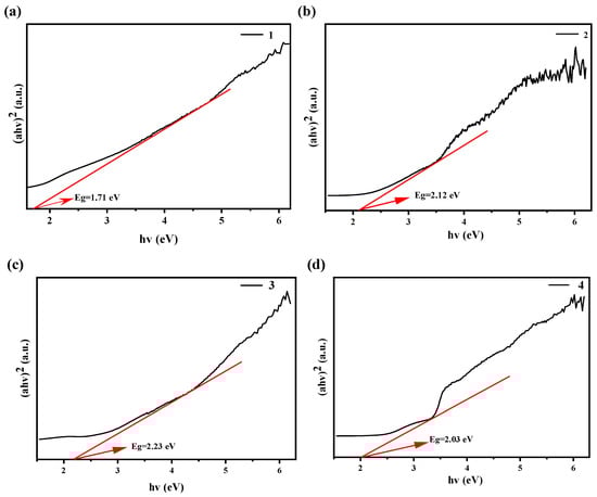 The band gap energy diagrams of compounds 1 (a), 2 (b), 3 (c), and 4 (d).