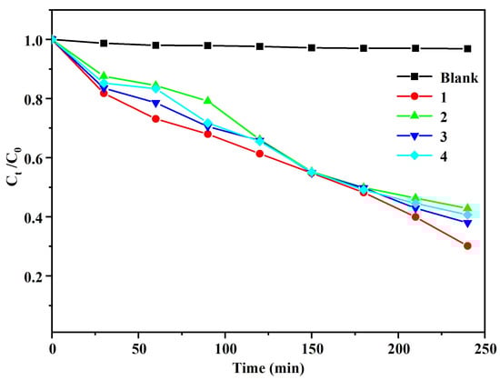 Figure 10 shows the effect of light time on the photocatalytic degradation of CIP by compounds 1–4. The degradation effects of compounds 1–4 on CIP are obvious. With the increase in light time, the concentration of CIP gradually decreases, and the degradation efficiencies are 86.95%, 67.18%, 62.02%, and 59.34%. According to the band gap value and photocatalytic degradation efficiency value, we can conclude that the smaller Eg is, the higher the photocatalytic efficiency is. Of course, there are many other factors affecting photocatalytic activity, such as separation and capture of photogenerated electrons and holes, crystal structure, lattice defects, etc. Here we only discuss the influence of band gap on it.