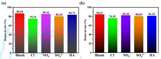 Various anions and organic compounds in water can also affect the photocatalytic degradation effect of compounds on antibiotics. Based on this, taking compound 1 and 3 as examples, Cl−, NO3−, SO42−, and HA were selected to explore the effects of anions and organic compounds on the photocatalytic degradation of CIP by compounds. The results are shown in Figure 11. When several anions and HA were added to the compound/CIP reaction system, the degradation effect of the compound on CIP was inhibited to varying degrees. HA was selected as the representative of organic compound, which also has a certain impact on the degradation effect of compounds. It can be seen from the figure that Cl- has the most obvious inhibitory effect on the photocatalytic effect. The wastewater with high salt content can be appropriately pretreated during the photocatalytic degradation of CIP in water.